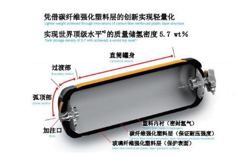 在动力系统的关键部件上,特别是储氢系统的安全方面,Mirai配置的两个储氢罐采用碳纤维+凯夫拉(防弹衣面料)材料,其外壳最大可承受70兆帕的压力,据丰田公布使用足以抵挡轻型武器的攻击,相比于国内普遍的35兆帕型储氢设备及加氢设施,还是领先不少。