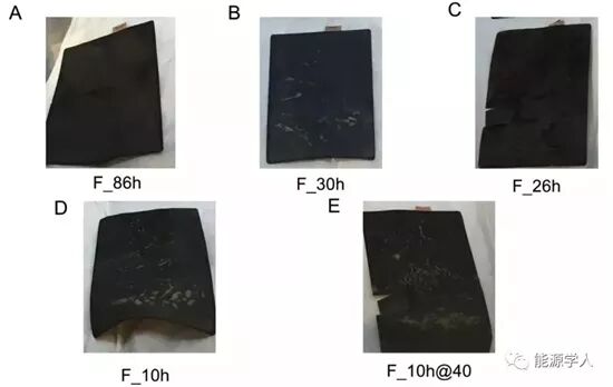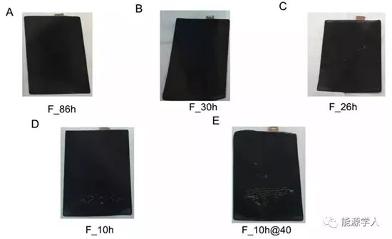 图2.化成完成后不同化成方案电池石墨电极极片情况(A)86h,(B)30h,(C)26h,(D)10h和(E)10h@40。