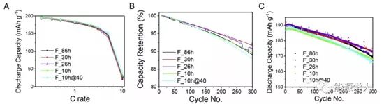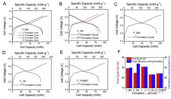 图1.不同化成方案的NMC811/石墨电池的充放电曲线(A)86h,(B)30h,(C)26h,(D)10h和(E)10h@40(F)不同方案电池的库仑效率。