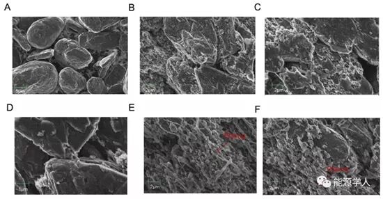 图6. 老化循环后石墨极片的SEM图像(A)新鲜石墨,(B)86h电池,(C)30h电池,(D)26h电池,(E)10h电池和(F)10h@40电池。