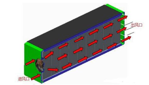 纯电动汽车中,动力电池系统是由多个动力电池单体电芯构成,在工作过程中产生大量的热聚集在狭小的电池箱体内,如果热量不能够及时地快速散出,高温会影响动力电池寿命甚至出现热失控,从而引发起火爆炸等事故。