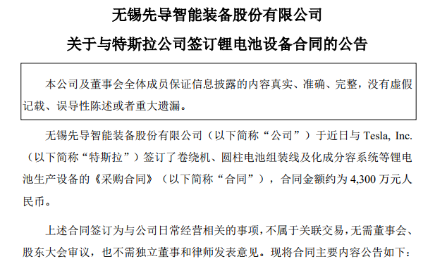 [摘要]12月26日,先导智能晚间公告称,公司近日与特斯拉签订了卷绕机、圆柱电池组装线及化成分容系统等锂电池生产设备的《采购合同》,合同金额约为4300万元。本次与特斯拉签署合同,代表着公司正式进入特斯拉全球配套体系,为公司与特斯拉后续合作奠定基础。