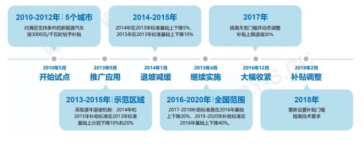 我国的新能源汽车补贴政策自2010年推出,始于国內5个城市的试点运行,按照3000元/千瓦时来补贴。