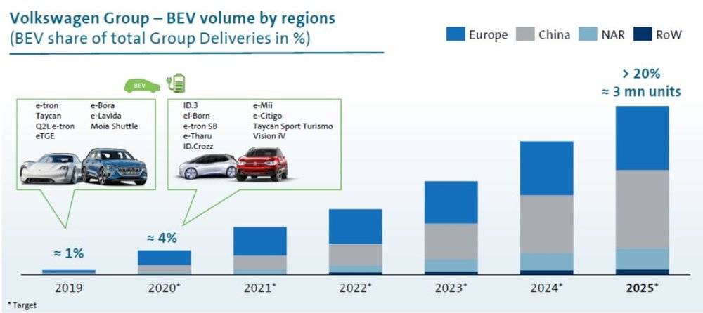 从海外来看,大众、宝马均已在新能源汽车领域大步前进。其中大众目标到2025年新能源汽车销量占比将从2019年的1%左右上升到超过20%,发展相当迅速;同时宝马也与宁德时代、三星SDI签订了2021-2031年合计103亿欧元的电池供货合同。
