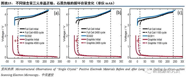综上所述,硅碳负极材料在高容量方面体现出了相当强的竞争优势,但是寿命相比于“长寿”的石墨负极仍有所不如,可以预期的循环寿命是1000次以上、容量保持率80%以上、倍率1C。所以,硅碳负极适合作为寿命同样相对略短的高镍三元正极(图示单晶NCM811正极循环1100次,衰减程度和NCM622正极循环2400次接近;关于单晶NCM正极寿命的研究可参见报告数风流人物,单晶NCM正极家族)的“搭档”,生产循环寿命满足常规使用需求,具备高能量密度的电池单体。