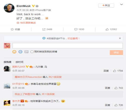 对于自己荣登财富榜首,马斯克凌晨疑似在其社交账号上发文回应:“好了,回去工作吧”。