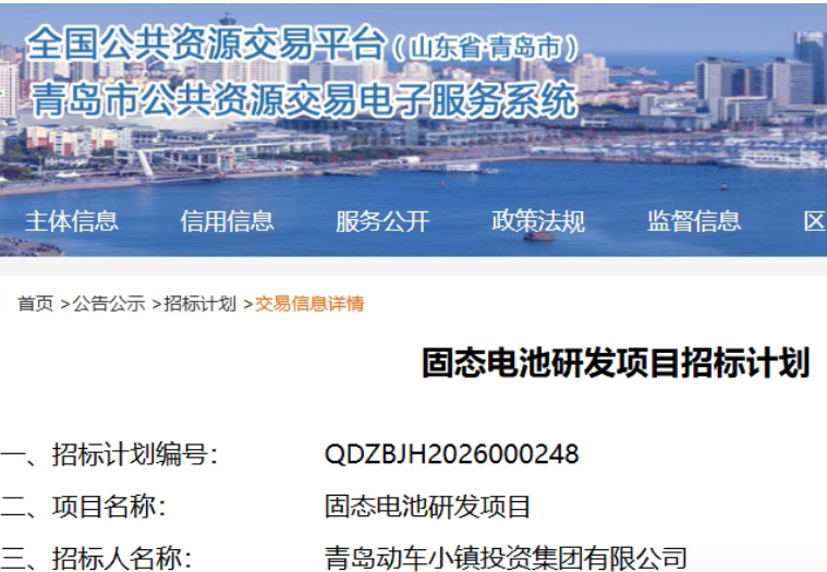 时间: 2026-03-207.49亿元!山东青岛固态电池研发项目招标计划公布