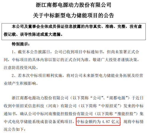 4月23日晚间,南都电源(300068)公告,公司近日收到中原招采发来的中标通知书,确认公司中标豫能控股集中式电化学储能系统成套设备采购项目,中标金额约为4.87亿元。