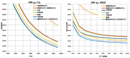 现有公司因为在生产消费电子电池过程中积累的经验可能会获得这个区间的较高值,虽然大制式电池可能要克服一些特有的挑战。较高的产出率是拥有相对较高成本结构的日本公司有效打败韩国竞争对手的方法之一,因为韩国公司一般成本结构较低、潜在收益也较低。制造中,产出优势会随着竞争者规模产量的增加、产出率随之提高而消失。