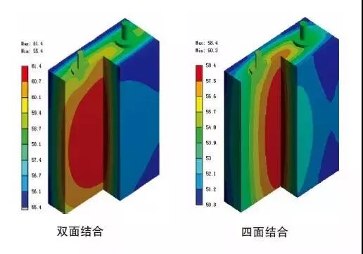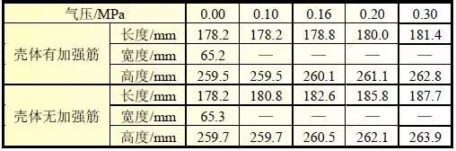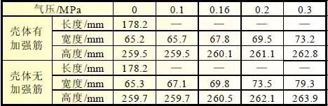加强壳体强度,把原来的平面壳体设计成加强结构,并以向壳体内部打压的方式,测试壳体加强结构设计的效果,按照固定方式的不同(固定长度方向和固定宽度方向),分别测试。可以明显观察到加强结构的作用。以宽度固定情形为例,在0.3Mpa压力下,有加强结构的变形量为3.2mm,而没有加强结构的壳体变形量达到4.1mm,变形量降低了20%以上。