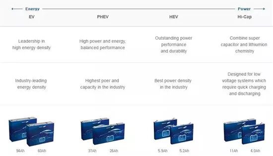 国外的主要厂家三星SDI,正极材料主要采用NCA和NCM,方形铝壳。著名案例宝马i3。三星官网显示的方形电池单体。产品包括高能量的BEV(纯电动)60Ah、94Ah电池; PHEV(插电式混合电动车)26Ah、37Ah电池(26Ah会逐渐被37Ah取代);HEV(混合电动车)5.2Ah、5.9Ah电池;高功率电池(4.0Ah、11Ah),共4个系列。