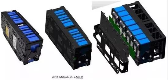 下图是三菱2011年的i-MiEV电池模块, PCB板采集cell的电压、温度,两端通过螺栓紧固。cell之间是最常见的busbar和螺栓连接方式。