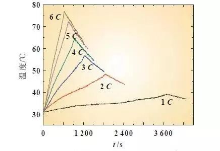 如下图所示,为不同放电倍率下电池表面的温度变化,可以看到,随着倍率增加,温度也越来越高,各放电倍率对应的电池表面最高温度分别为38.1、48.3、56.7、64.4、72.2、76.9 ℃。3C 倍率放电时,最高温度已超过50 ℃。6C 时温度达到了76.9 ℃且超过50 ℃的时间为470 s,占到了整个放电过程的三分之二,这对于电池安全持续工作非常不利。
