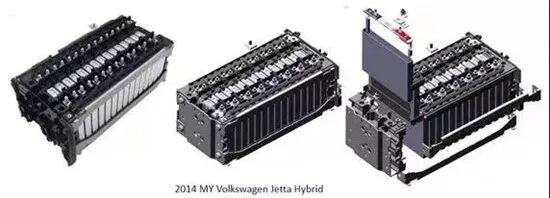 下面是2014MY大众捷达HEV的电池模块,通过侧面的两根压条来紧固模块,端板外侧加上塑料盖板进行绝缘。