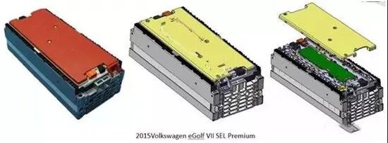 大众eGolf2015MY电池模块,端板的设计的功能比较丰富,减重的同时满足了结构强度需求,还达到了组装时的需求,采用PCB板采集cell信息,模块两端只需要留出低压接头(现在采用这种方式的模块越来越多了)。