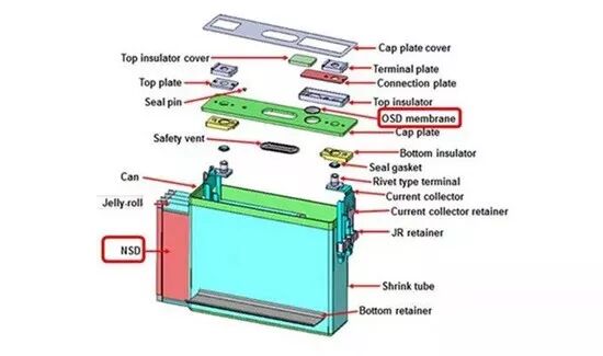 一个典型的方形锂电池,主要组成部件包括:顶盖,壳体,正极板、负极板、隔膜组成的叠片或者卷绕,绝缘件,安全组件等。其中,红圈中的两个是安全结构,NSD针刺安全装置;OSD过充保护装置。
