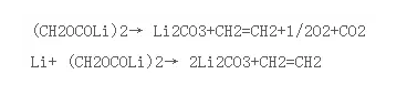 SEI由两层物质构成,内层主要成分是Li2CO3,而其外层主要成分是烷基碳酸锂如(CH2OCOLi)2等。当电池内部温度为80-120℃时,外层逐渐发生分解,放出热量生成气体,反应方程式如下。在SEI热解反应中,其反应温度和放热量与锂盐种类、溶剂组成、负极活物质及电池循环次数有关。